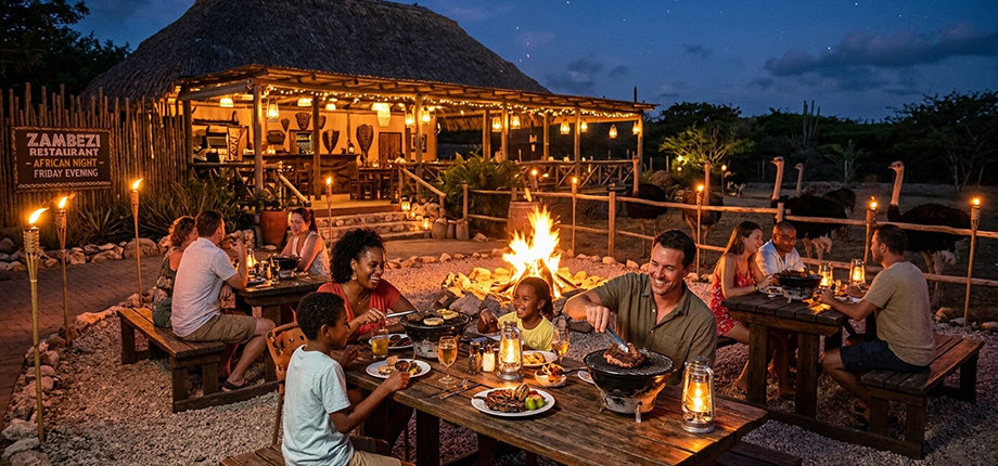 The Curaçao Ostrich Farm is situated in a unique landscape along the road to Groot St. Joris in the East of Curaçao. Our Ostrich Farm promises guaranteed fun for the entire family! Immerse yourself in a South African experience for a day. Indulge in all that our restaurant, Zambezi, has to offer, while the children play in the playground or explore our outdoor mini zoo. The restaurant serves both breakfast and lunch. Don’t forget to stop by our souvenir shop to acquire local and original Ostrich Farm keepsakes to bring a piece of the experience home with you.